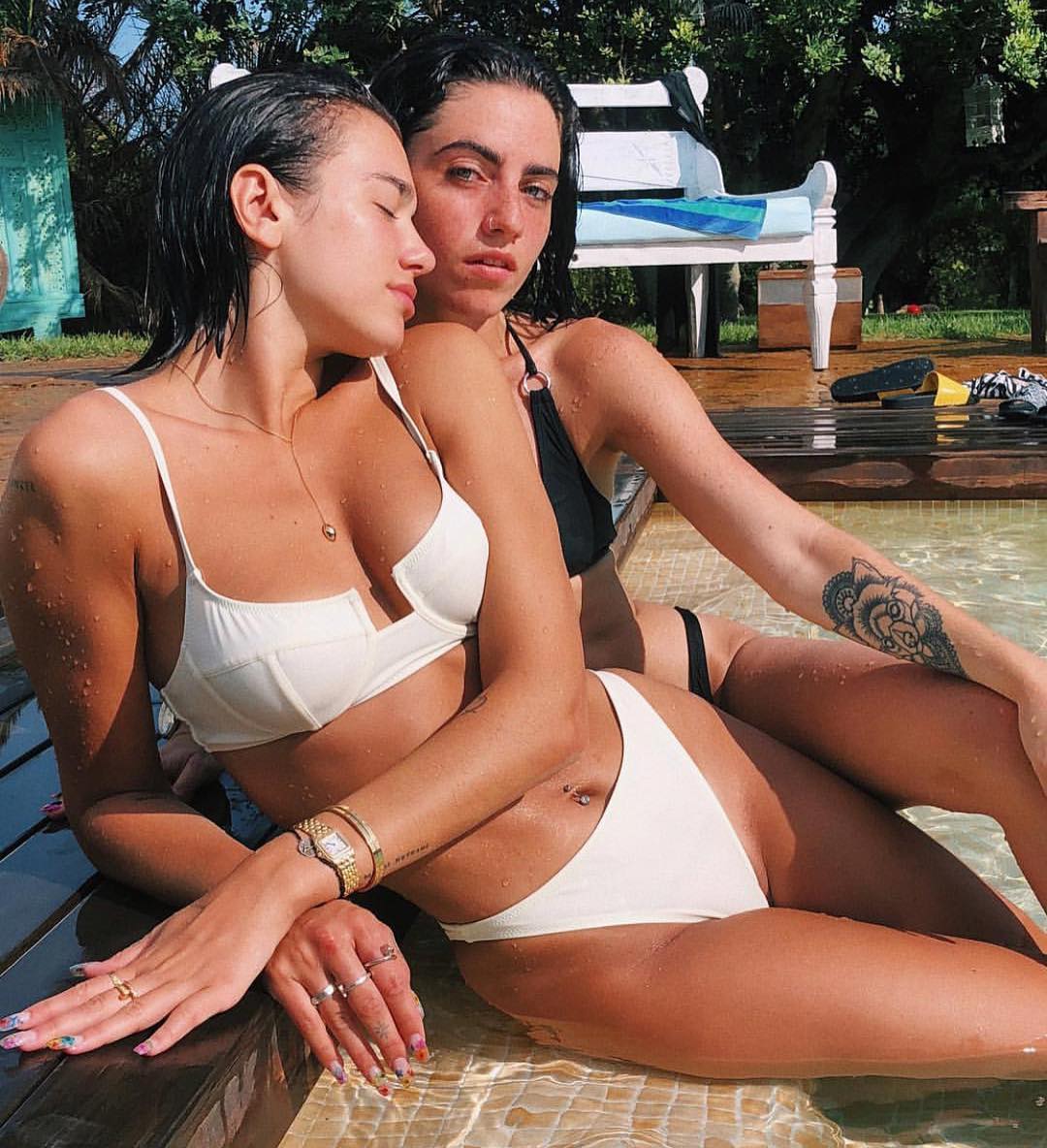 Папарацци запечатлели Дуа Липу на отдыхе в откровенном купальнике, где она позирует на песке. На фотографиях певица изображена в красных бикини и демонстрирует фигуру.